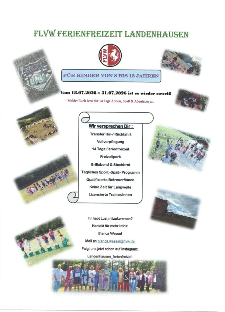 Auch für 2026 ist wieder eine Ferienfreizeit in Landenhausen geplant. Diese findet vom 18.07.2025 bis zum 31.07.2025 statt. Auch in 2026 sind wieder viele Aktivitäten geplant. Dazu gehören schon standardmäßig der Besuch im Spaßbad, der Besuch eines Freizeitparks und der Besuch der Stadt Fulda. Ansonsten stehen Spiel., Sport und Spaß auf dem Programm. Dies wird dann noch angereichert mit Disco-Abenden und der Veranstaltung "Landenhausen sucht den Superstar". Die Betreuung erfolgt wieder von einem engagierten Team aus Betreuerinnen und Betreuer. Der Teilnehmerbeitrag beträgt in diesem Jahr 499,00 €. Das Anmeldeformular ist hier und im Downloadbereich zu finden.